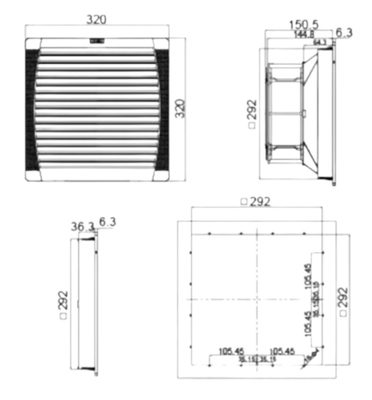 Вентилятор FK 5526.230 с фильтром FK 5526.300, 560 м3/ч,325x325x148мм, вырез 291x291мм, IP54, RAL7035